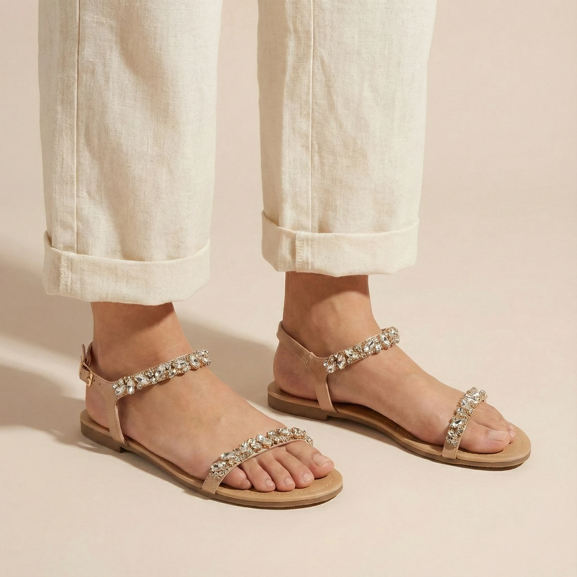 Shine bright with every step. These chic nude flats feature two rows of sparkling crystals that catch the light beautifully. Comfortable, secure, and effortlessly glam—your new wardrobe essential.
