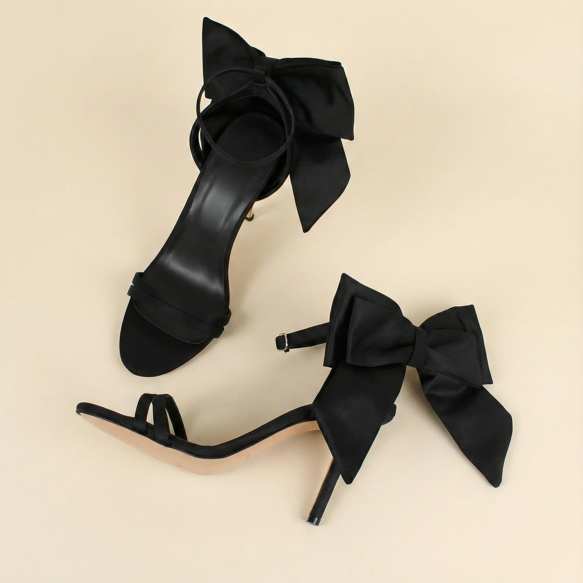Step into sophistication with our Midnight Bow Stilettos. These stunning black sandals are the perfect blend of minimalism and drama. Featuring a sleek open-toe design and a delicate ankle strap for a secure fit, the real showstopper is the oversized, structural satin bow at the heel. Whether it's a wedding, a gala, or a romantic dinner, these heels ensure you leave a lasting impression as you walk away.